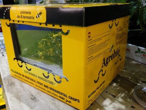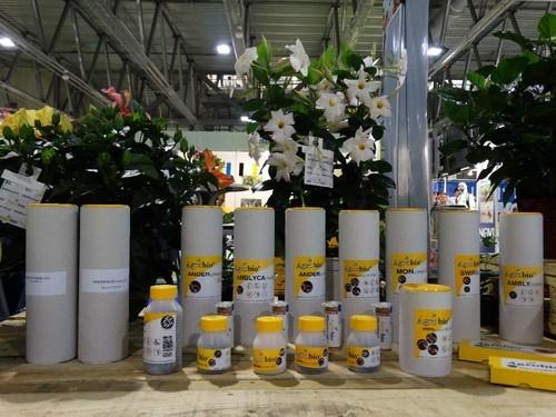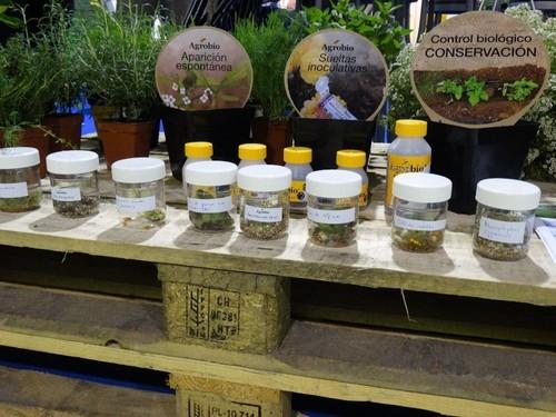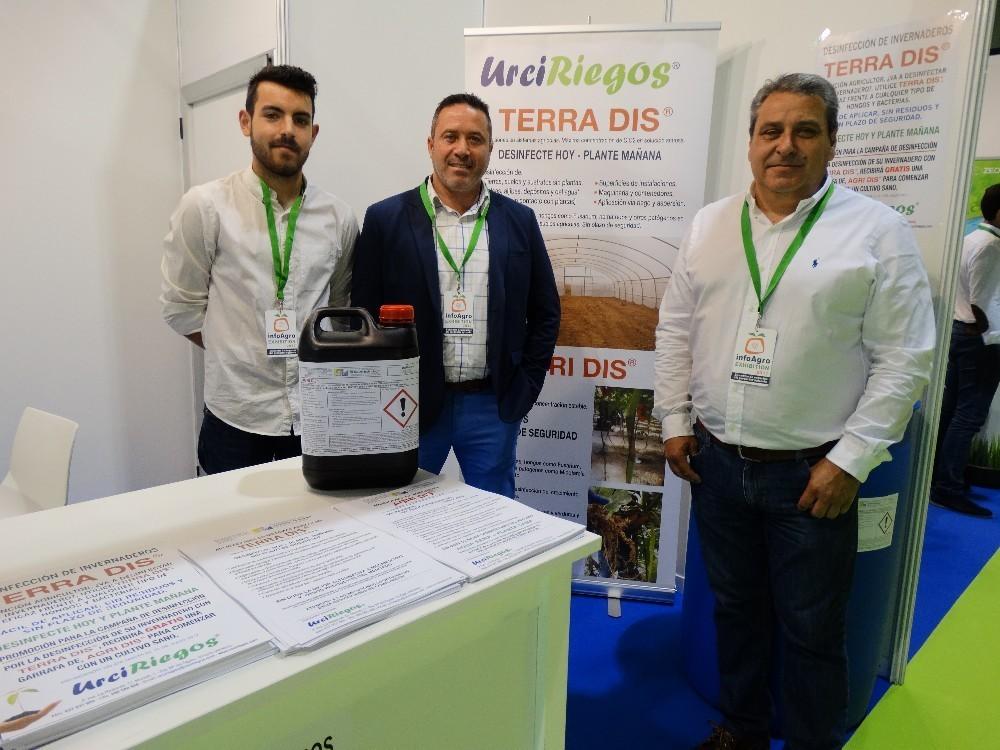 Miguel Martínez (derecha), de Urciriegos, junto a otros compañeros, mostrando Terra Dis y Agri Dis, dos desinfectantes con cero residuos, que distribuye la propia empresa