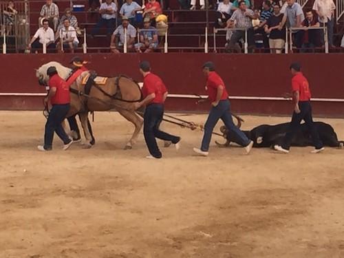 Empleados de la plaza sacando a unos de los novillos del ruedo después de la faena.