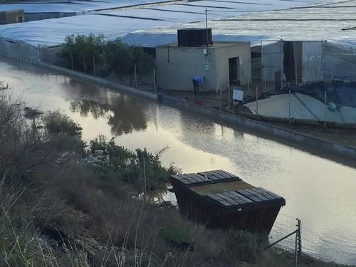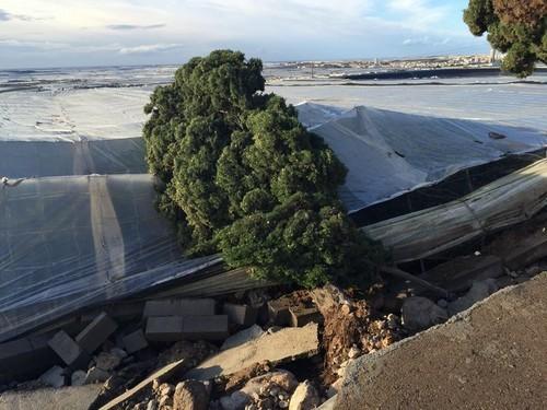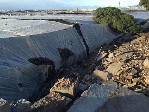 El agua volvió a entrar en los invernaderos y en esta instantánea se muestra un muro derrumbado sobre un invernadero en la zona norte de Sª Mª del Águila, paraje conocido como Los Canarios