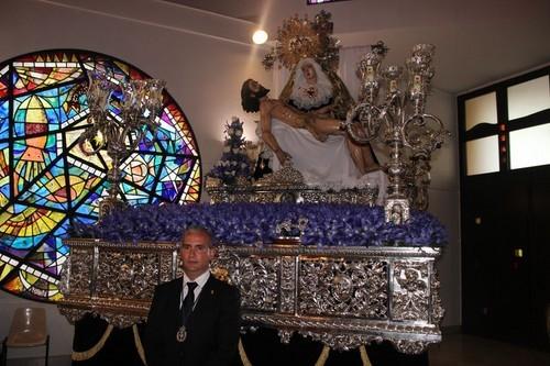 El capataz de la Virgen de las Angustias, Sergio Carrascosa, posa con la venerada Imagen, en el templo. /Rafa Villegas