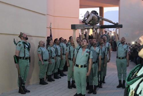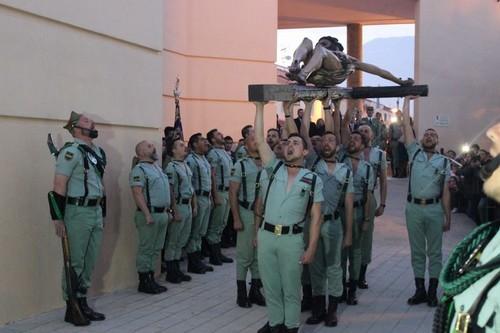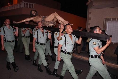 Por su barrio. Caballeros legionarios portando el Santísimo Cristo de la Buena Muerte por la calle Loma de la Mezquita de El Ejido. /Rafa Villegas