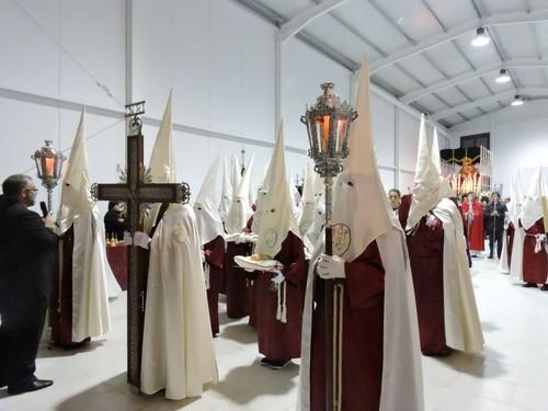 Preparados. Los penitentes y la Virgen de los Dolores salieron desde su recién estrenada Casa Hermandad, en Santa María del Águila. /Elena Sánchez.