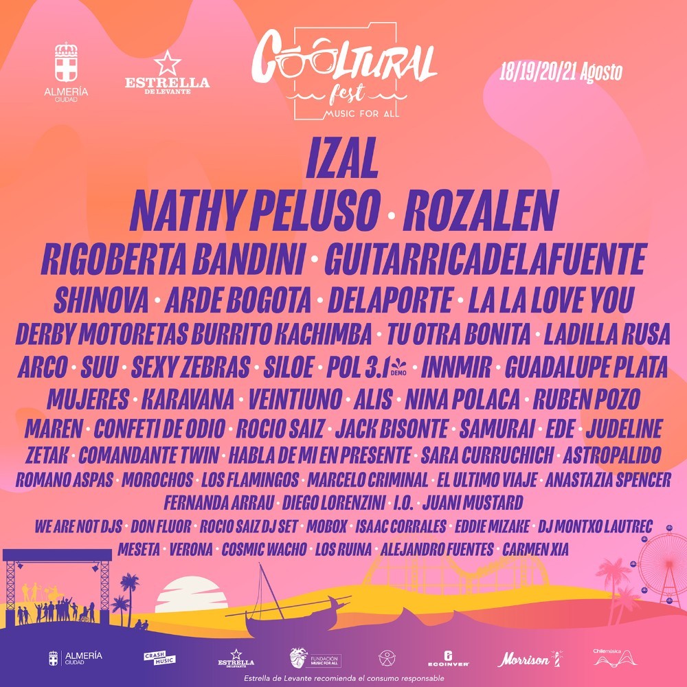 Con el anuncio de más de quince bandas y artistas y casi una docena de DJ’s en apenas tres días y después de anunciar que habría una jornada extra con la fiesta de bienvenida, el festival almeriense Cooltural Fest ha cerrado el cartel para su quinta edición, que se celebrará en plena Feria y Fiestas de Almería, del 18 al 21 de agosto. Guitarricadelafuente, Sexy Zebras, Guadalupe Plata, Tu Otra Bonita, Veintiuno, Mujeres o Rubén Pozo son los nombres más destacados de las nuevas incorporaciones, que se completan con Zetak, Los Flamingos, Anastazia Spencer, Siloé, Jack Bisonte, Judeline, Sara Currichich, Romano Aspas y Morochos. Además, también se ha dado a conocer la lista de DJ’s que amenizarán con la mejor música los intercambios entre los distintos conciertos, con We Are Not Dj’s, Don Fluor, Rocío Saiz DJ Set, Mobox, Isaac Corrales, Eddie Mikaze y DJ Montxo Lautrec.