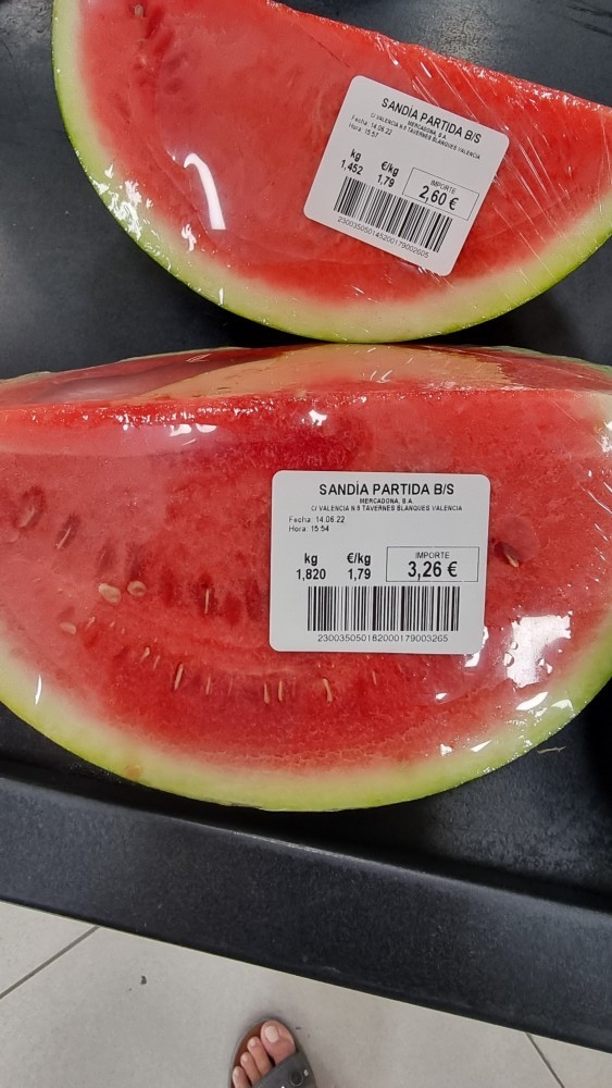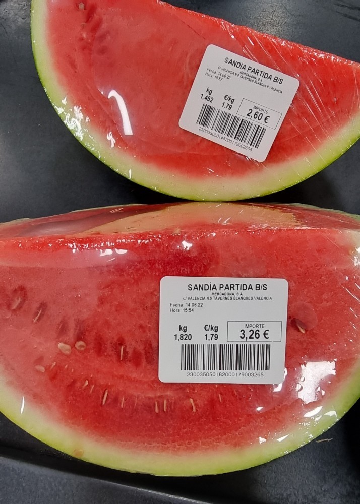*El valor de la sandía a 1,79 euros por kilo. *El precio del melón en el supermercado a 2,49 euros por kilo.