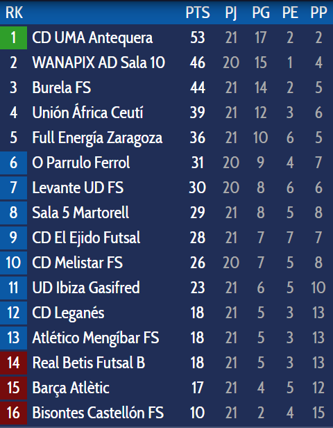 Este fin de semana Leganés recibe a Sala 5 Martorell; el Betis B se medirá a Full Energía Zaragoza; Barça Atlétic recibe a Burela FS; Melistar se enfrenta a Levante, este último llega tras una semana de parón tras aplazarse su partido del pasado fin de semana ante O’Parrulo, que se medirá al líder, UMA Antequera; Unión África Ceutí recibe a Mengíbar y WANAPIX AD Sala 10 se mide al colista, Bisontes Castellón.