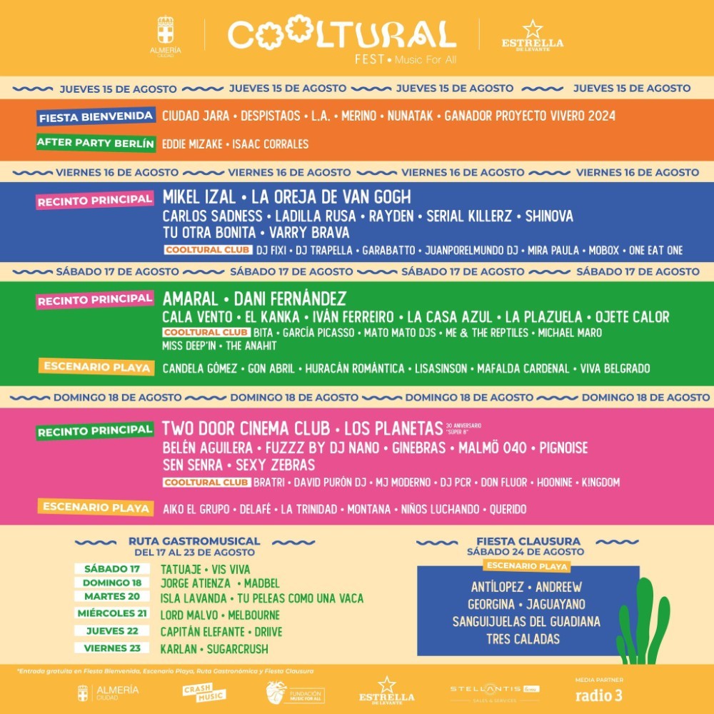 Mikel Izal, La Oreja de Van Gogh, Amaral, Dani Fernández, Two Door Cinema Club, Los Planetas con su Super 8… Así hasta casi un centenar de nombres propios que no solo actuarán en el Recinto de Conciertos del Ferial (16 al 18 de agosto) sino también en la fiesta de bienvenida del día 15 en el Parque de las Almadrabillas, bajo el imponente Cable Inglés, en el ‘Escenario Playa’ de conciertos diurnos junto al mar Mediterráneo en la Faluca, en el centro de la ciudad con la Ruta Gastromusical, con el ciclo ‘Cooltural Kids’, dedicado especialmente a ‘peques’ de la casa y con una fiesta de clausura el 24 de agosto, también en la Faluca.